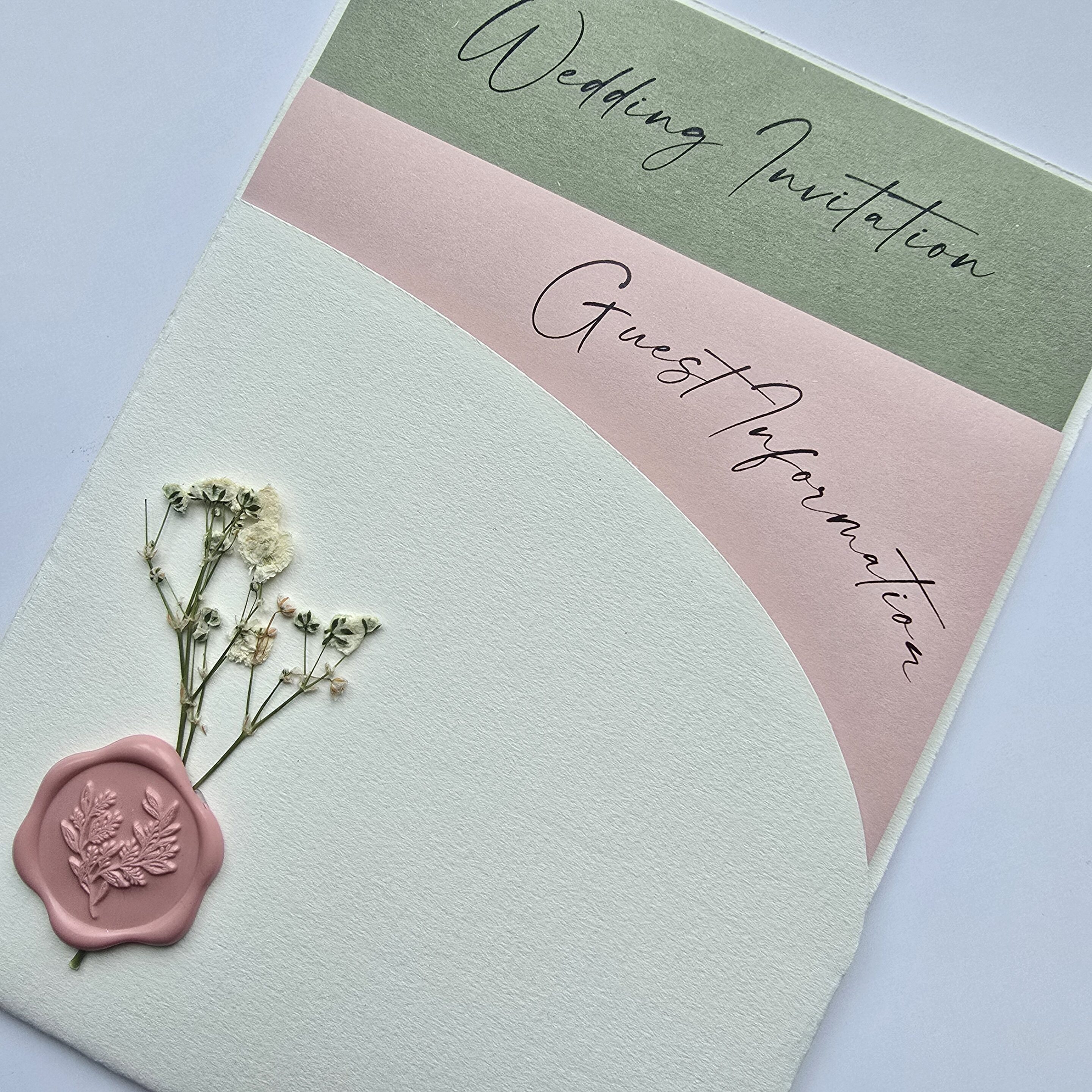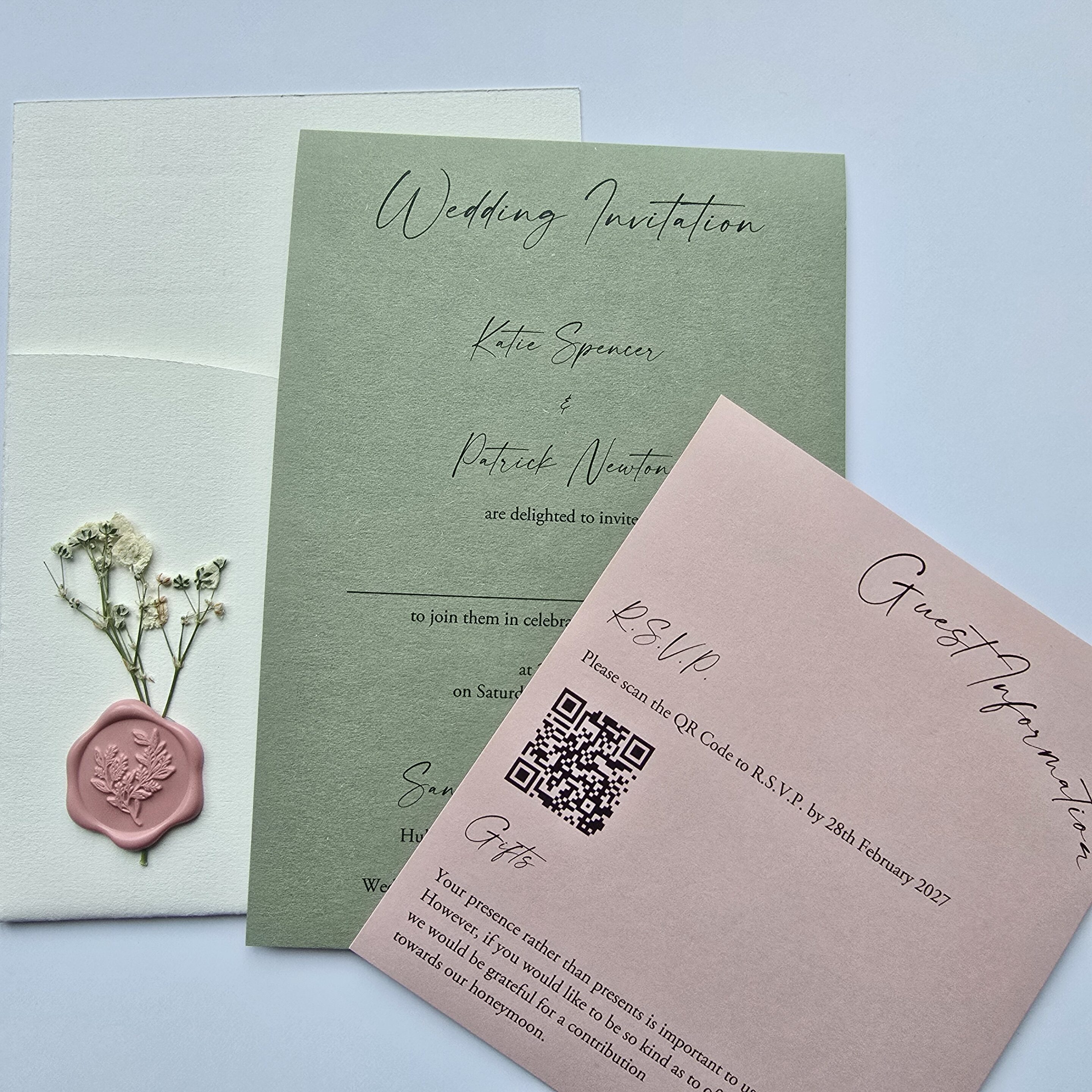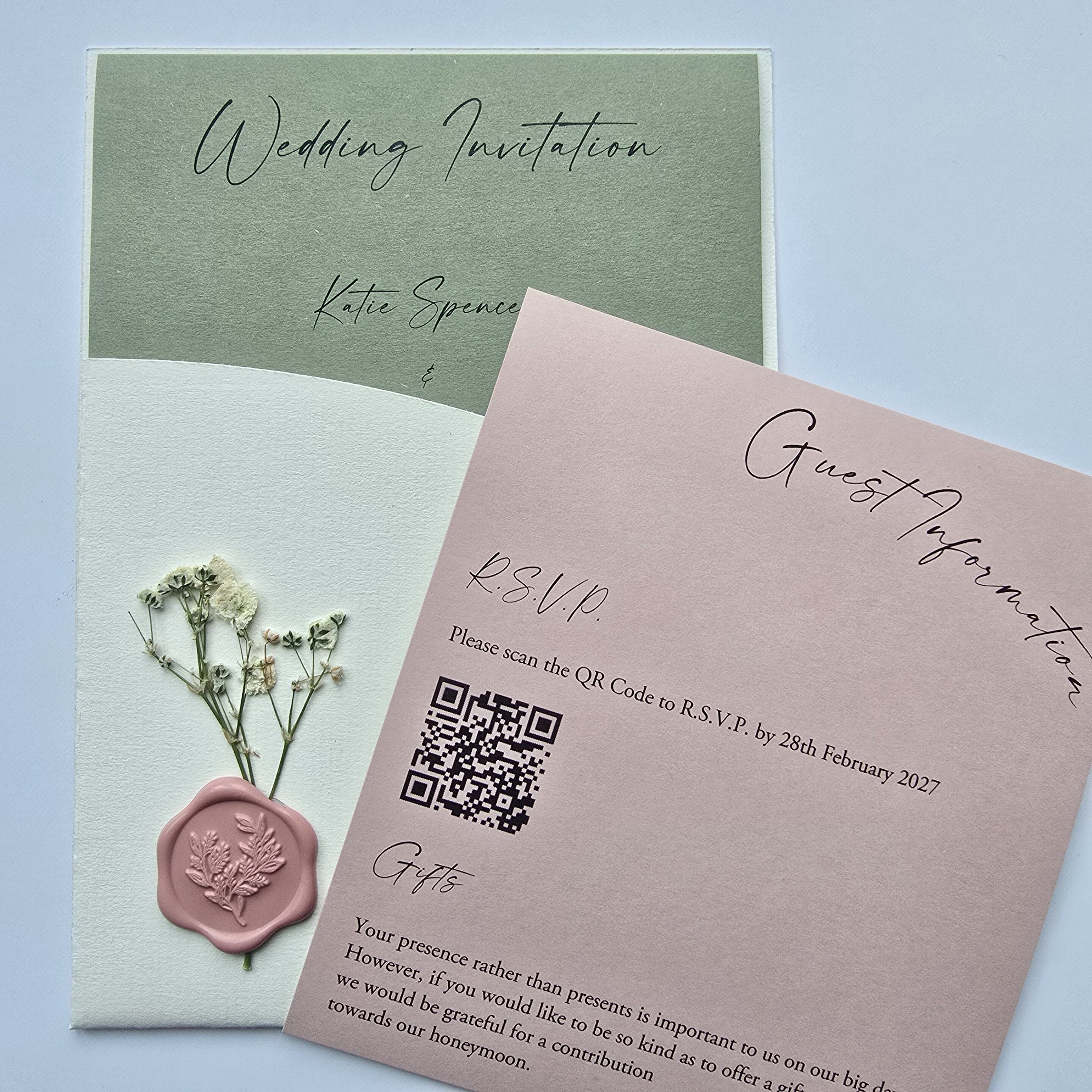 This pretty flat pocketcard style wedding invitation has a lovely rustic feel, featuring an ivory, sage green and dusky pink colour scheme. The design is finished with a pink wax seal and dried pressed gypsophila. Our flat pocketcard invitations feature 2 loose inserts as standard which are neatly stacked- one with your invitation details and the other guest information.
