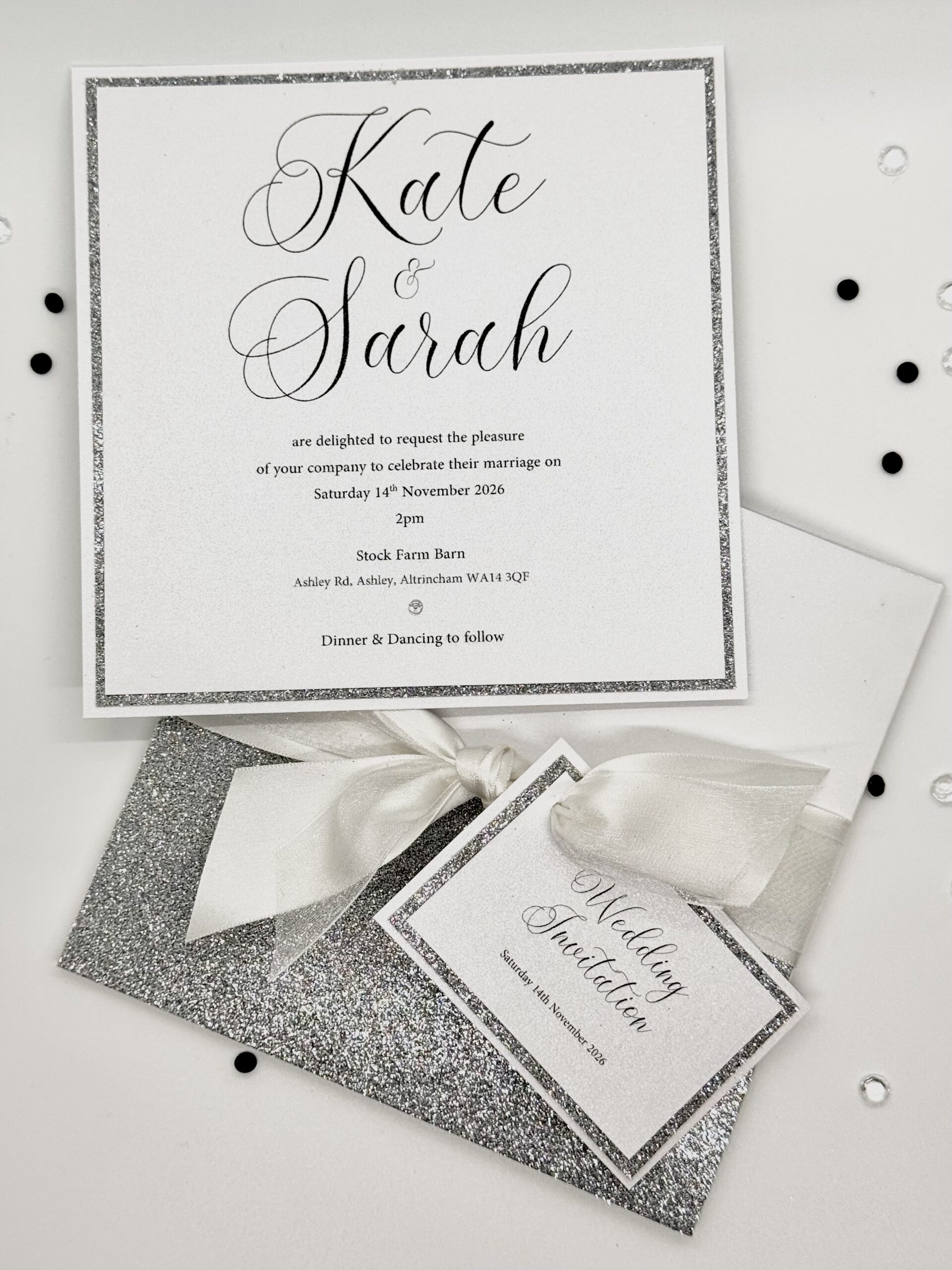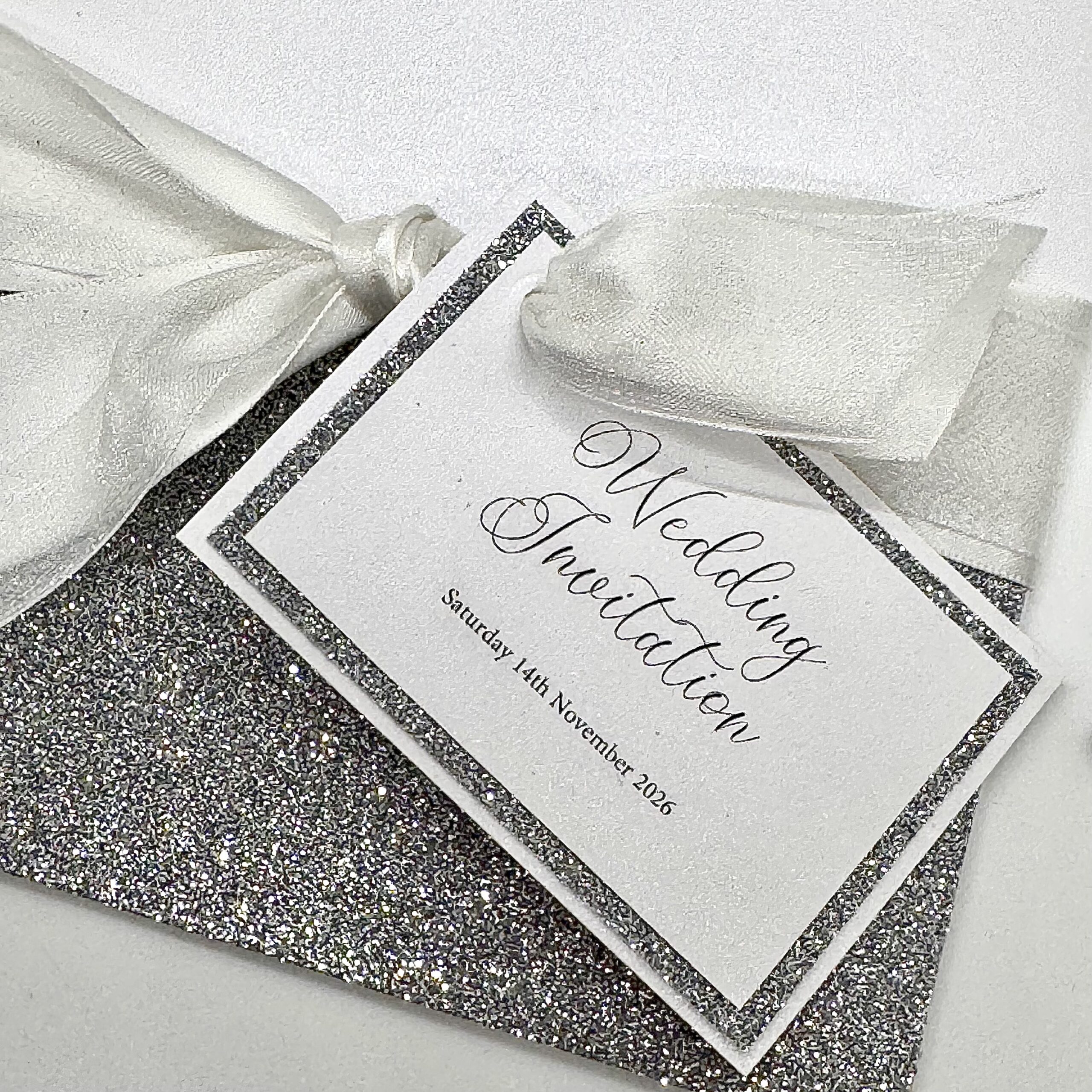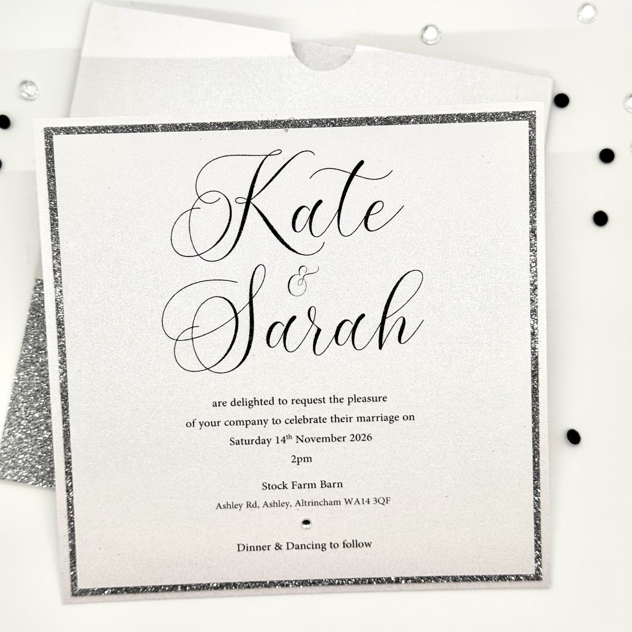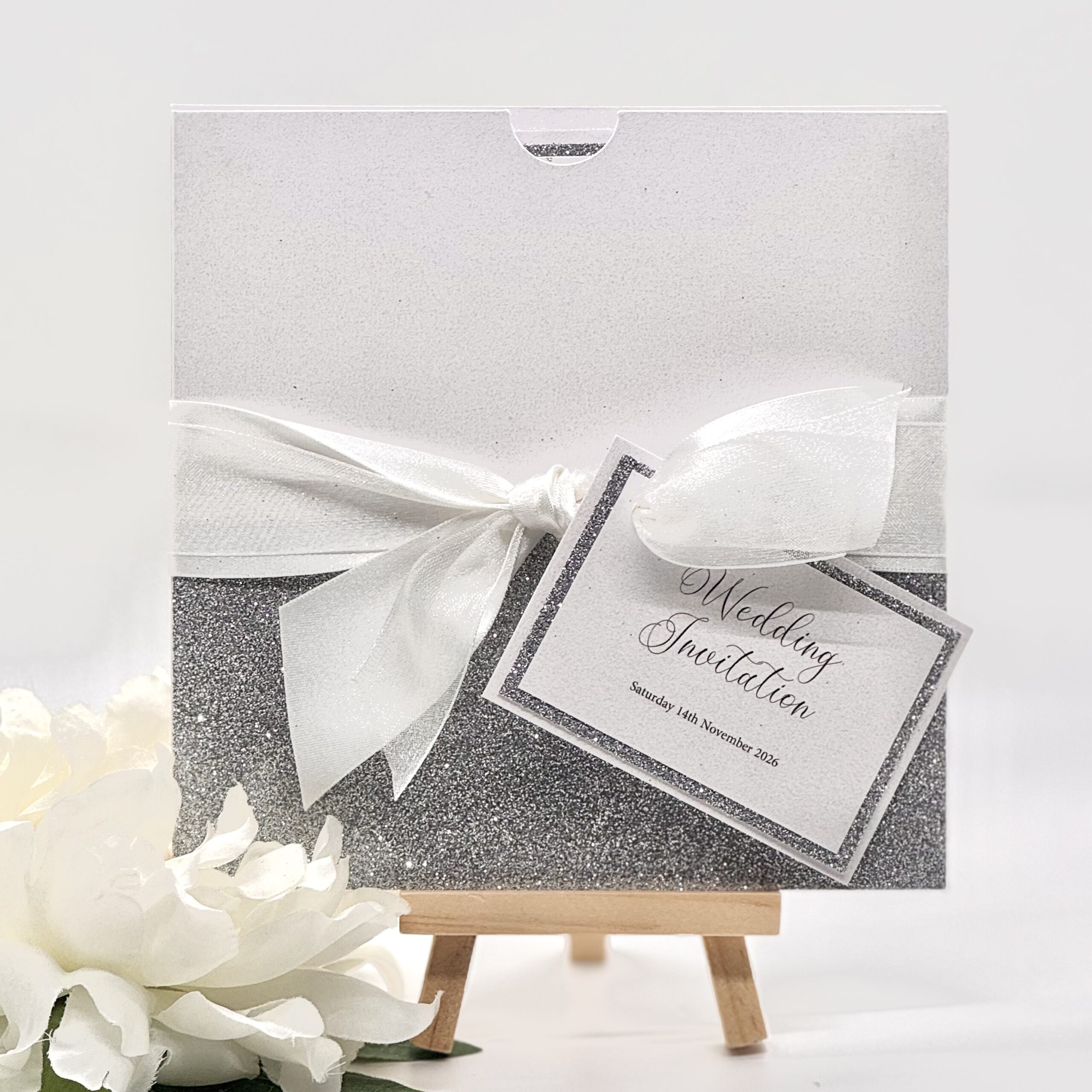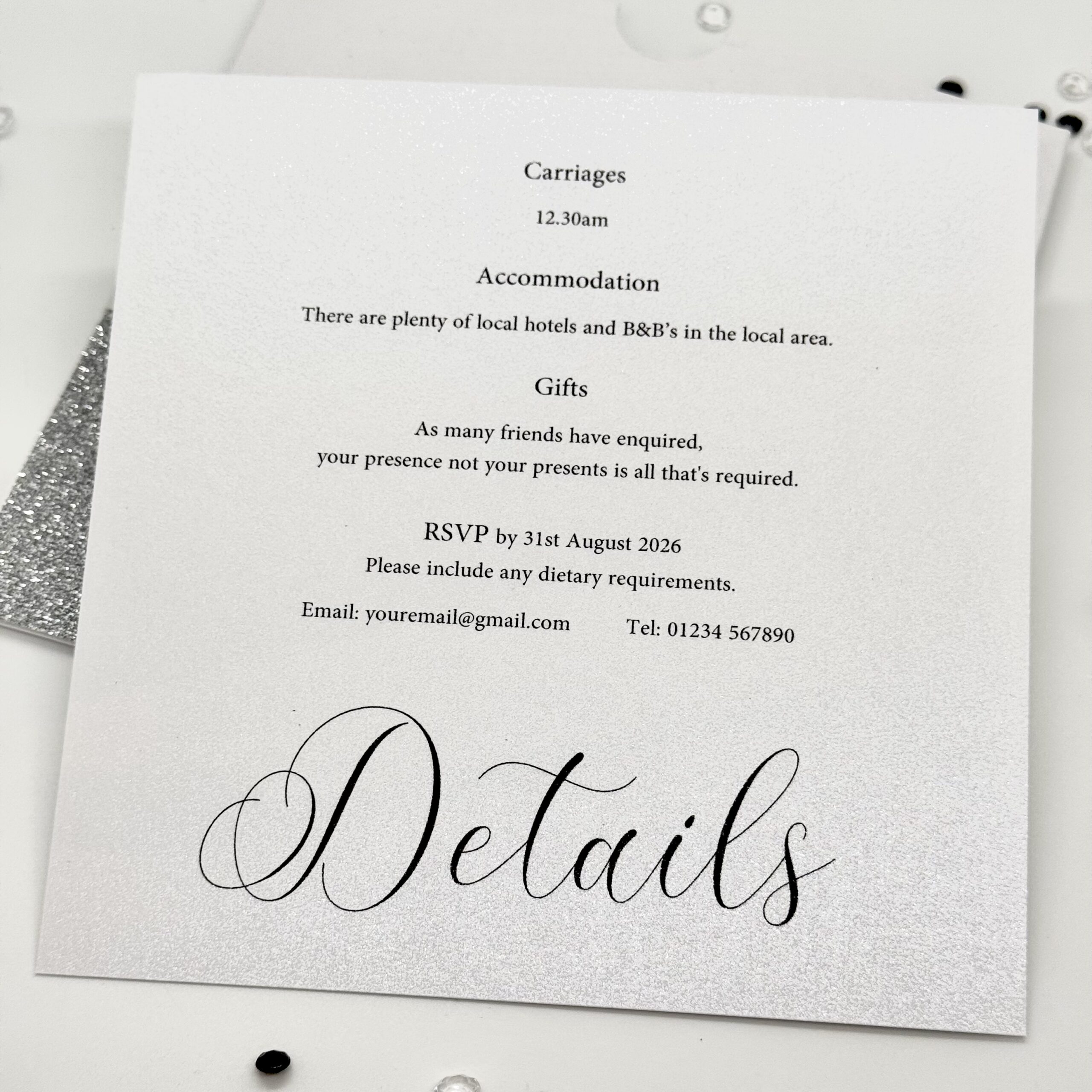 The internal card can be pulled out of the white pearlised wallet to reveal your wedding invitation details on one side, with your guest information on the reverse. The card is layered with silver glitter to match the wallet design. This is a stunning invitation.