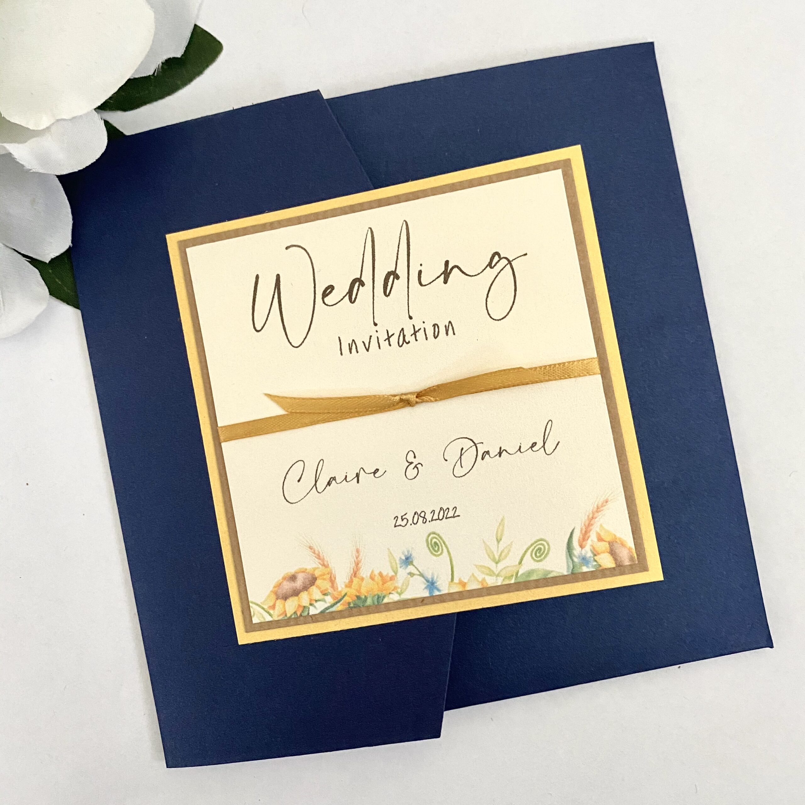 Navy Pocketfold Wedding Invitation with a Wildflower Illustration