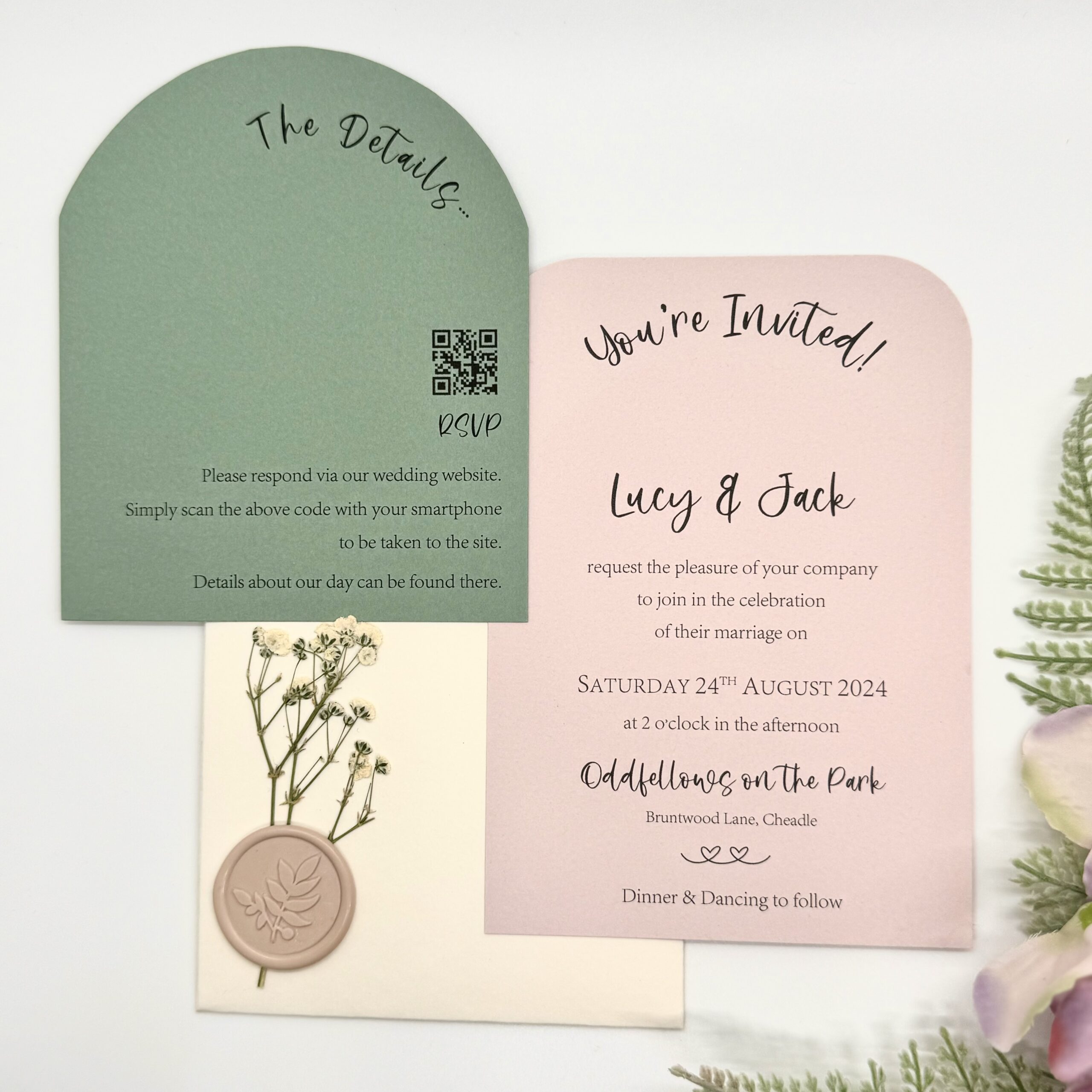 This pretty invitation has a vintage festival vibe featuring a muted cream, pink and sage green colour scheme. The design is finished with a colour-coordinated wax seal and dried pressed flowers. The arched cards add a contemporary feel. Our flat pocketcard invitations feature 2 loose inserts as standard which are neatly stacked- one with your invitation details and the other guest information.