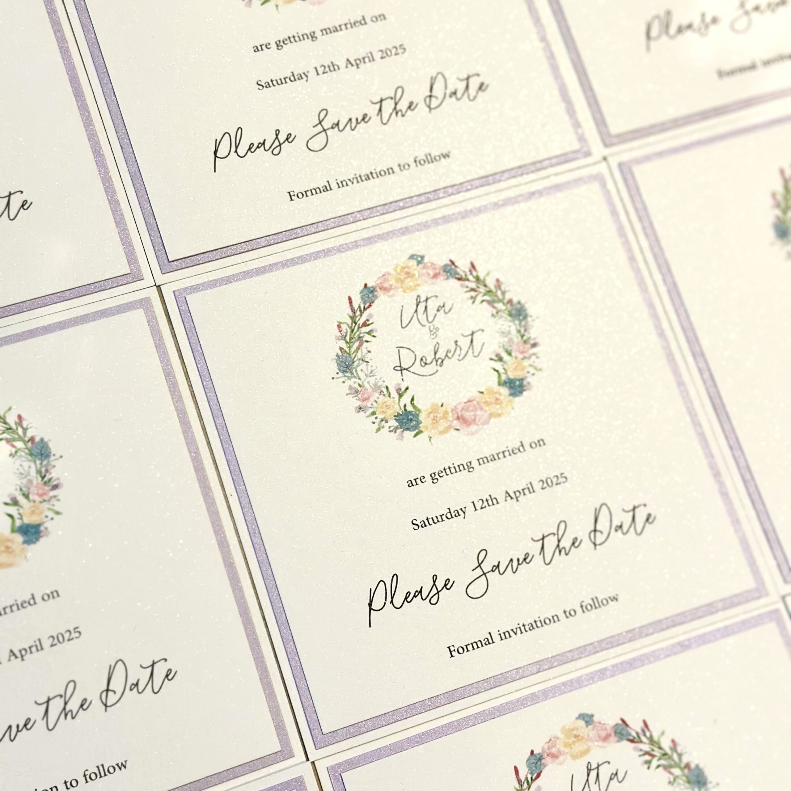 This Save the Date card showcases a delicate floral wreath illustration that frames your names in the centre. A lilac mount card and further ivory back mount add weight and a luxury feel to the design.
