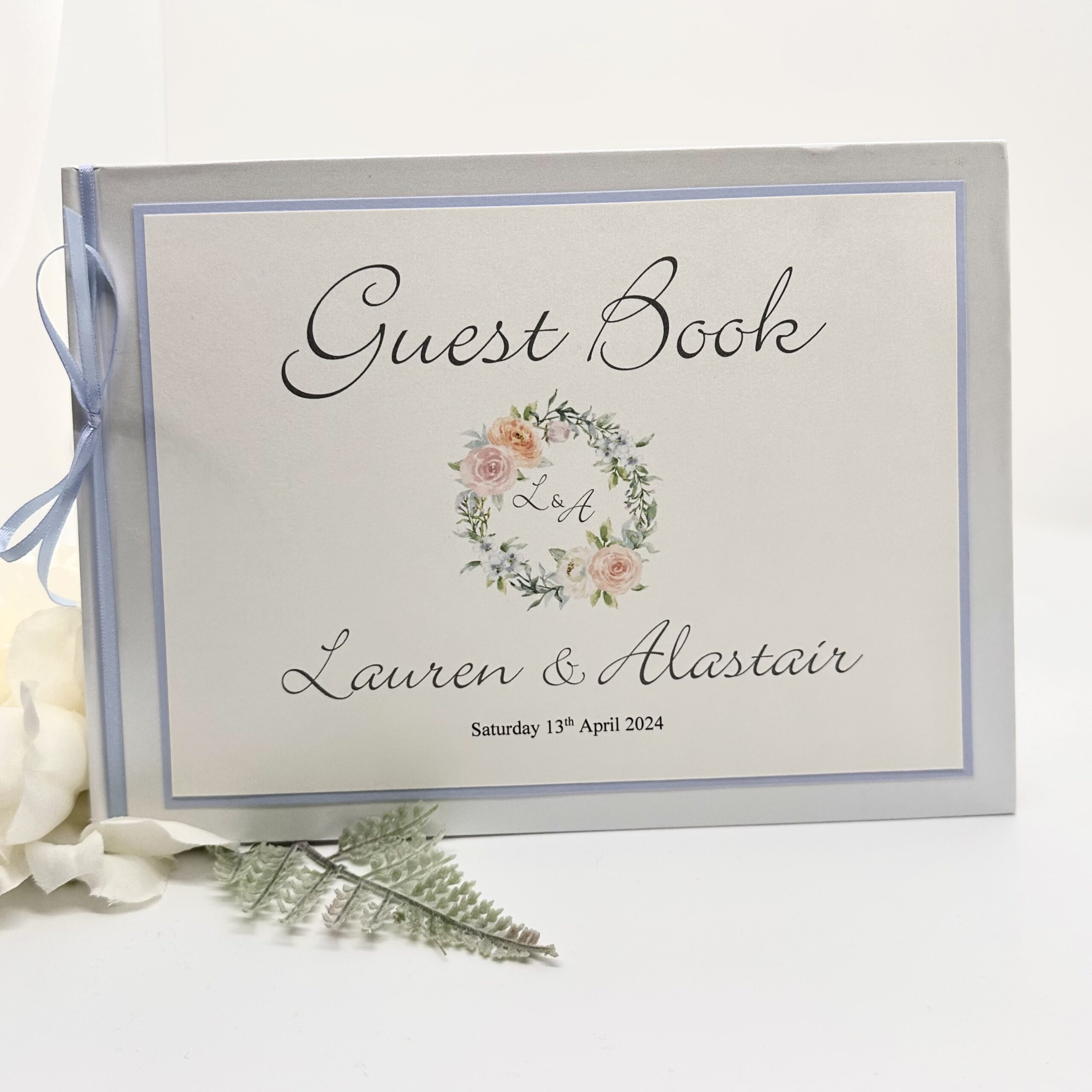 This pretty wedding invitation is perfect for spring or summer weddings. It features a lovely wreath design, a blue mount card, matching knotted ribbon and folds out to reveal a mounted invitation along with a built-in pocket with two loose inserts. We include a minimum of two loose inserts as standard which are perfect for presenting all your essential wedding details.
