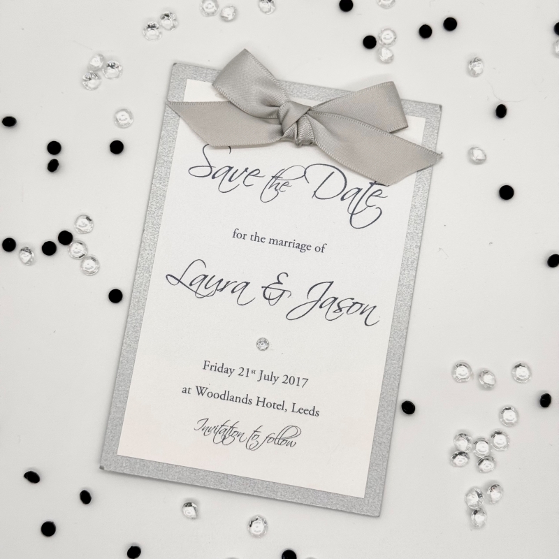 Inspired by vintage charm, this elegant Save the Date card features two layers of fine card, topped with a silver satin ribbon bow and finished with a classic diamante detail – a beautifully romantic way to mark the beginning of your love story.