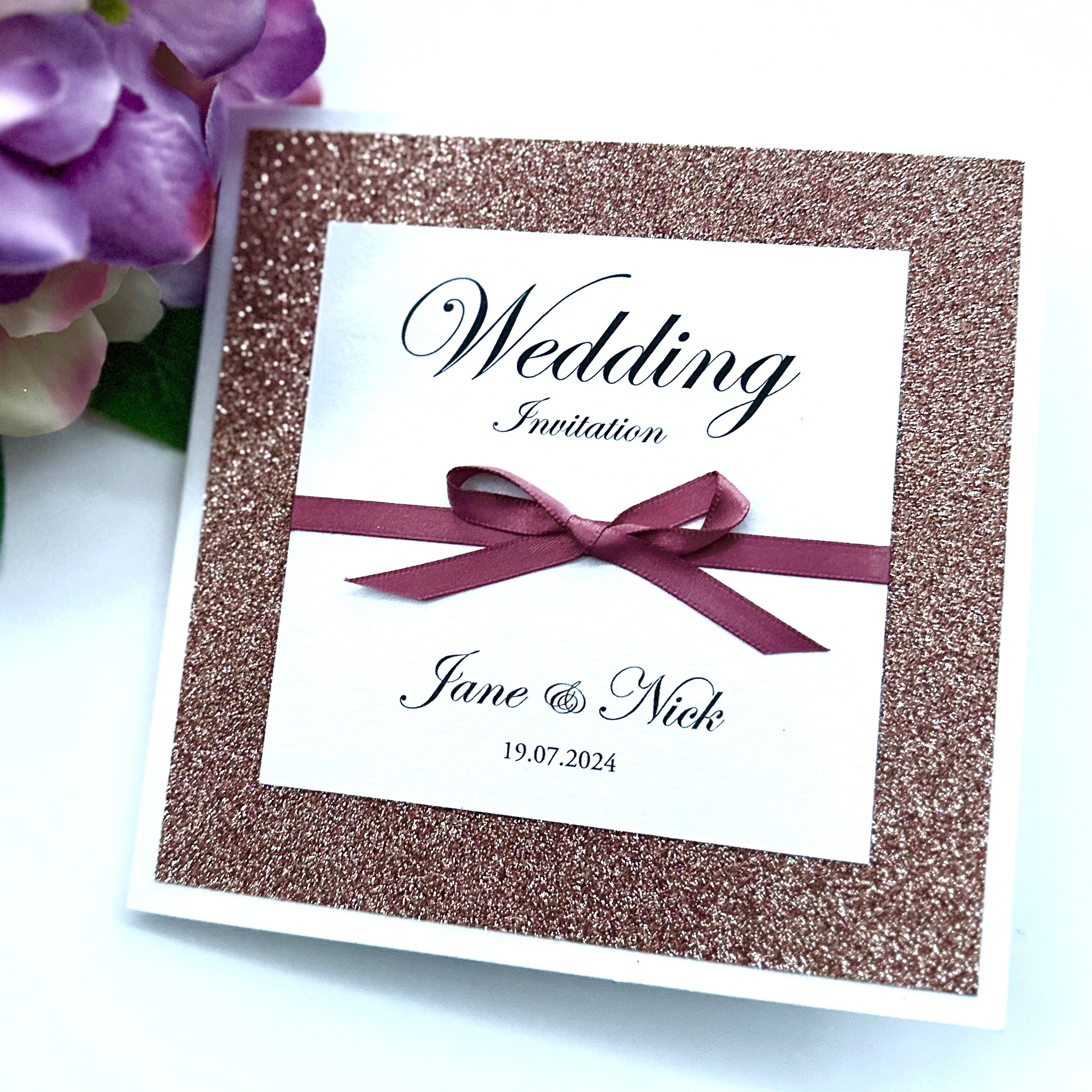 This luxury folded wedding invitation design features a large rose gold glitter-card cover mount.  I can fully personalise this design with the personalised plaque, ribbon colour and a bow for you too.  Inside there is a folded pearlised paper insert with all of your wording on.  Alternatively, you could opt for a pocket with loose inserts inside instead.