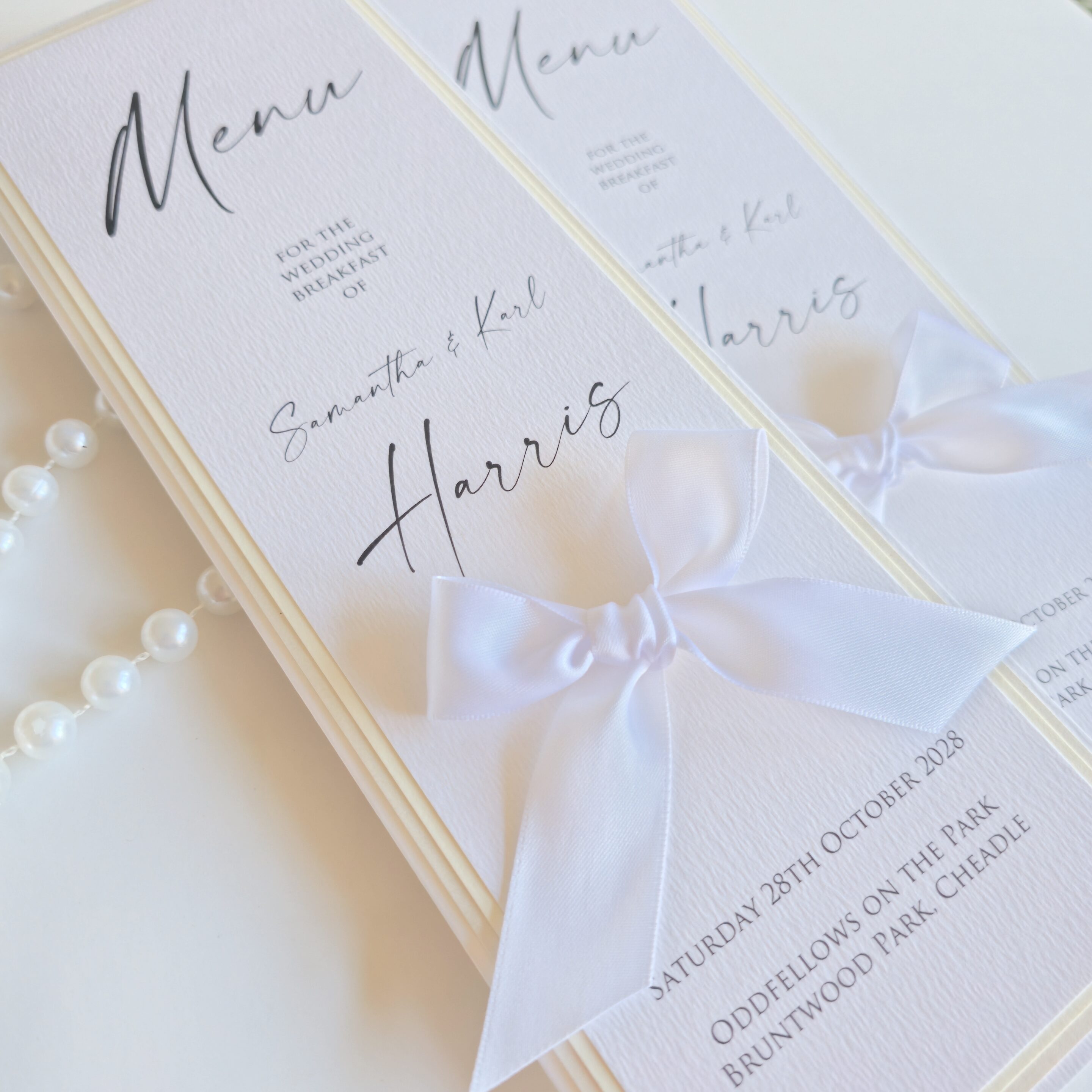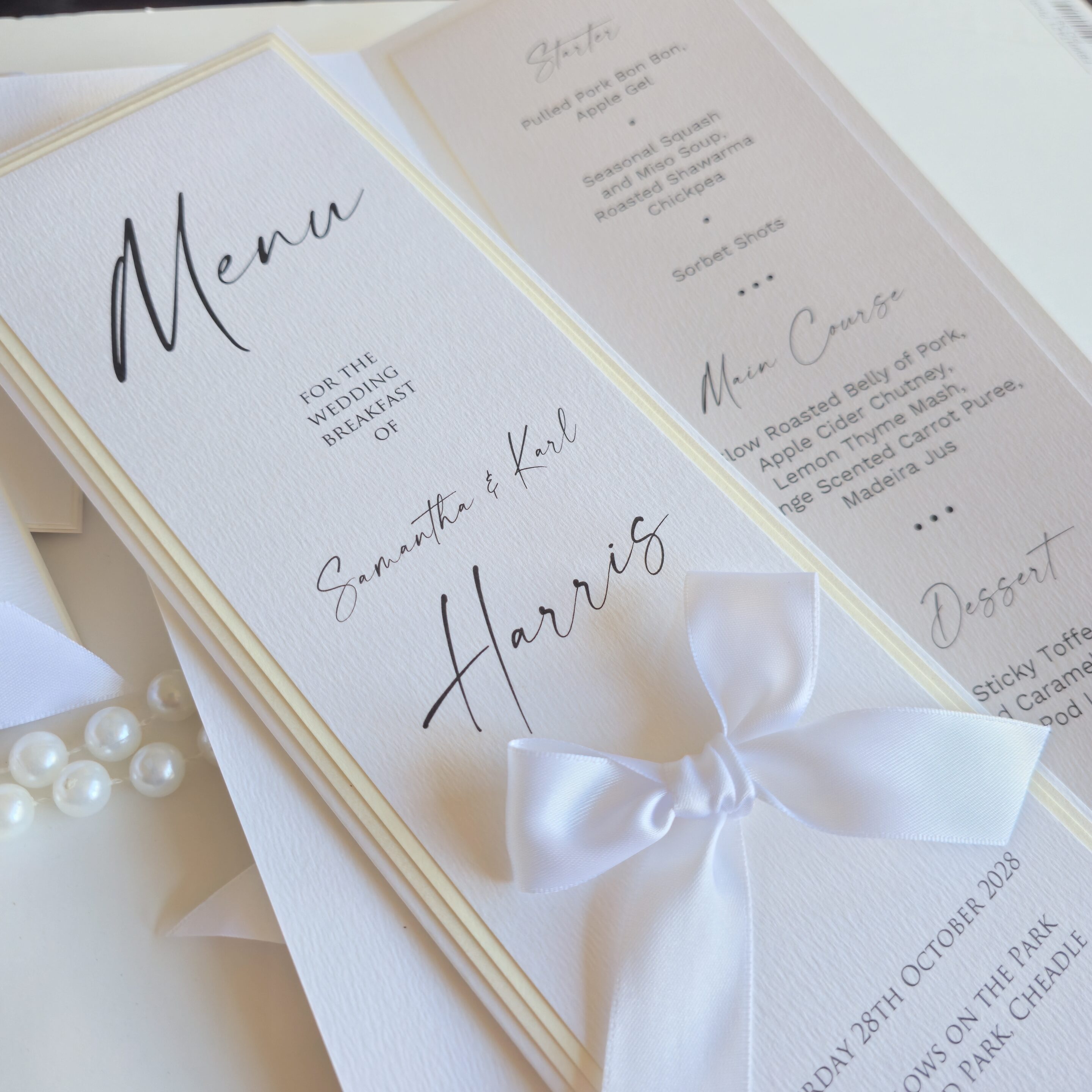 Add a truly personal touch to your wedding day with our beautifully crafted folded menu cards. Each menu features a triple-mounted cover and large ribbon bow. The samples shown in the product photos have a white and ivory colour scheme but we’re happy to change that for you.