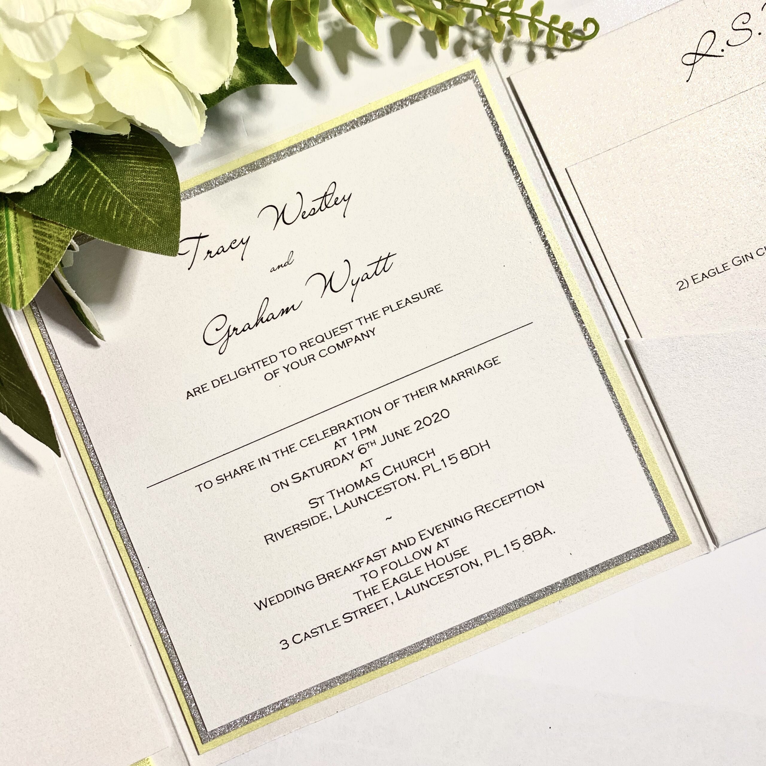 Make a bright and beautiful introduction to your wedding day with this luxury pocketfold style wedding invitation. This design features a sunny yellow and silver colour scheme, with the silver glitter adding that extra special sparkle. The front cover features a triple-mounted, personalised plaque, with a yellow satin ribbon which works really well with the silver glitter card and white pearlised card inserts.